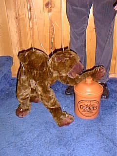 Large Bear Marionettes The Brown Bear (or Bruin in Europe) is a large, stocky, omniverous mammal with thick coarse fur and a very short tail. They like berries, fish and obviously cookies. These 38 inch tall string puppets are available in Brown (WB965A) and Black (WB965B). |