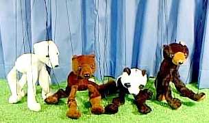 Small Bear Marionettes These 8 inch tall Bear string puppets come as (left to right): Polar (WB366), Brown (WB365A), Panda (WB340) and Black (WB365B). |