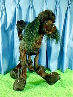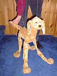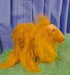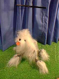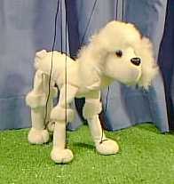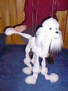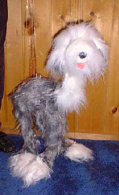 Large Sheepdog Marionette (WB933) This Large Sheepdog String Puppet is 38 inches tall from the control to the bottom of the puppet's paws. He really does have eyes, back somewhere under all of that fur. All four legs walk as you rock the control from side to side. |