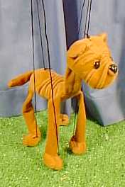 Small Shar-Pei Marionette (WB346) Here's one of those "wrinkled dogs" again. Except this one's a puppet. We assure you, it has just as many wrinkles as his large and medium counterparts above. This little puppet is 8 inches tall and works easily with a simple control. |