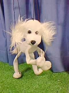Small Poodle Marionettes These small puddles stand about 8 inches tall, not counting the length of the strings. Um... we mean "puddle" not "poodle"... wait. No. It's "poodle" not "puddle." As you might guess we had a bit of a problem with the newspaper training. Just rock the control from side to side to make the puppy walk. Available in White (WB343A), Black (WB343B) and Pink (WB343C). |