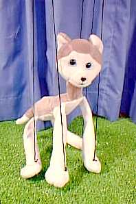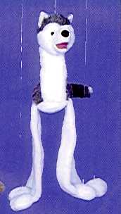 Large Husky Marionette (WB949) According to Webster's New Collegiate Dictionary (1960) this popular breed of dog is described as: "Contemptuous - A worthless..." oops. That was "hussy" (darn small print)! Here it is: "Husky - An Eskimo Dog of unstandardized breed." Oops. Now that we've made both our Artic Native neighbors and pet lovers everywhere angry at us, we will give our dictionary back to Merriam and simply state that this beloved Husky pup is 38 inches tall and can be induced to walk, scamper and jump by simple motions of the control. |