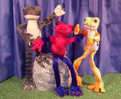 SMALL MARIONETTE FROGS On the left we have Crosby our Cape Ghost Frog (WB3215). In the center is Stills our Strawberry Frog (WB3213) and at the right is Nash our Red-eyed Tree Frog (WB3204). These three frogs have been buddies since they were tadpoles and started their own "rock" group with a real rock. Each of these Small Frog Stirng Puppets is about 13 inches tall (21 inches to control). |
