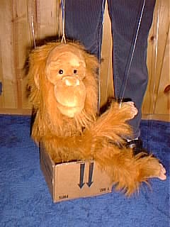 Large Orangutan Marionette (WB937) Orangutan tranlates to "Forest Man" in the Pidgin Malay language. This ape resides in Borneo and Sumatra. Just rock his control from side to side to make him walk. 38 inches tall. |