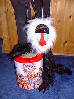 Large Mandrill Marionette (WB964) This large West African (male) Baboon has a ribbed blue and scarlet muzzle designed to appeal to the ladies of the area (we prefer "Old Spice" ourselves). 38 inches tall. |