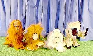 More Monkey Business And these Small Monkey Marionettes are also 8 inches tall and come as (left to right): Orangutan (WB337), Monkey (WB363), Baboon (sold out, sorry) and Gibbon (WB335). |