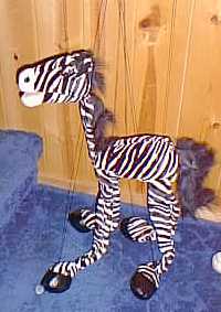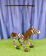 Large Zebra Marionette (WB953) This Large Zebra Marionette sports his natural coloring which is designed to make him invisible while romping through the high grasses of the plains. Here in the living room, of couse, he can be plainly seen! He stands a full 38 inches tall and can be make to gallop by simply rocking his control from side to side. |